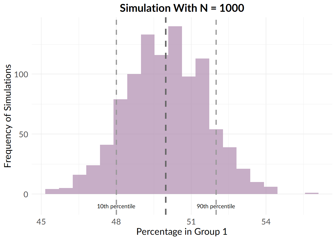 From this plot, we see that on average, we wind up with a roughly equal number of participants in each group, but, there are a lot of samples with large group imbalance.