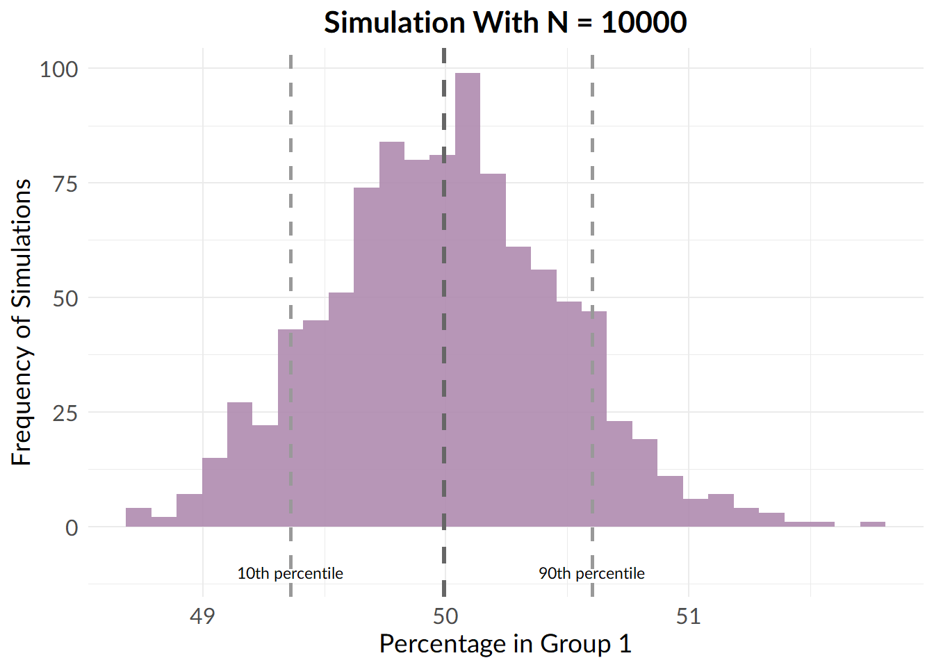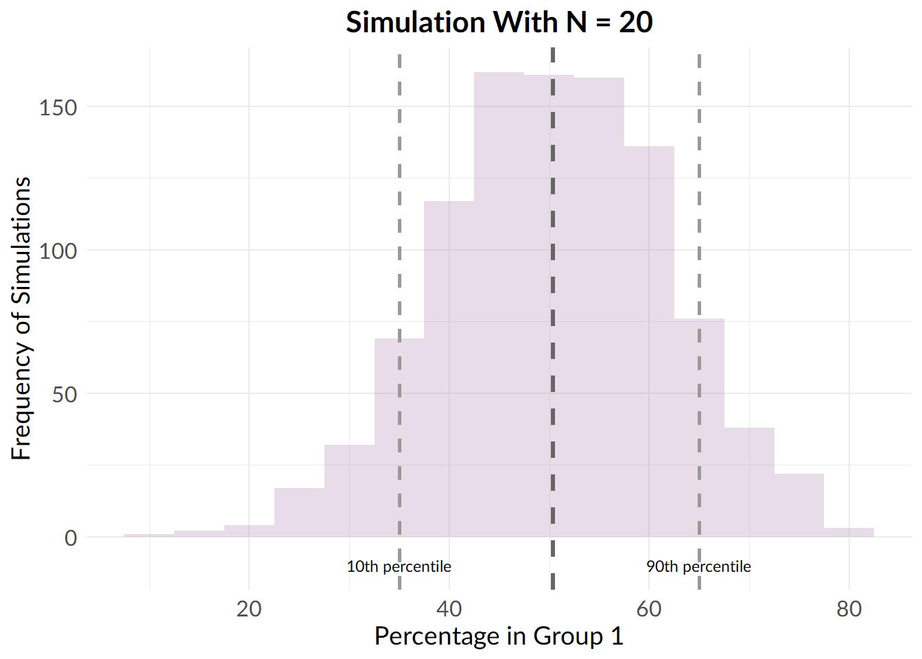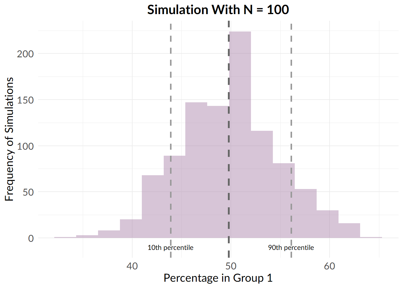 Well, when we have a sample size of around 100 participants, we frequently obtain imbalanced groups. For instance, in 10% of my simulations, I wound up with 35% or fewer participants allocated to group 1.